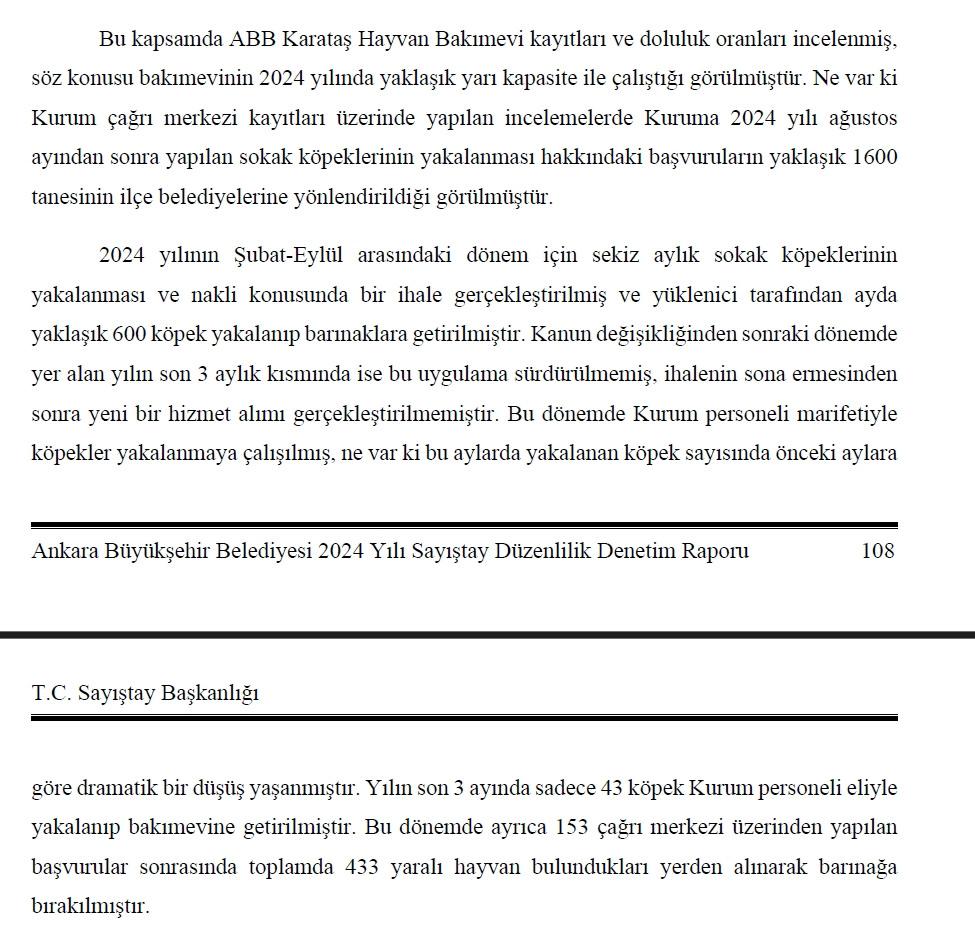 Sayıştay raporunda, 2024 yılının Şubat-Eylül arasındaki dönem için sekiz aylık sokak köpeklerinin yakalanması ve nakli konusunda ihale gerçekleştirildiği ve köpeklerin ihaleyi kazanan yüklenici tarafından toplandığı belirtildi.