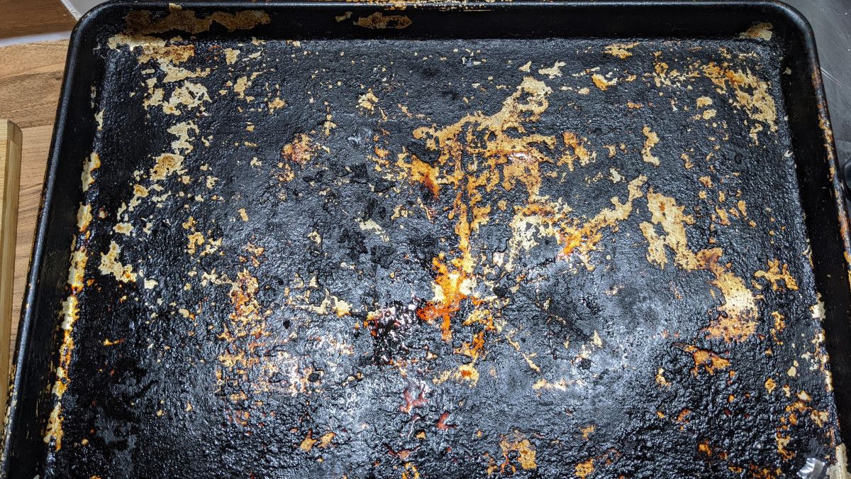 Tuzun renginin koyulaşmasıyla birlikte kalıntılar da çözülüyor. İşlem tamamlandıktan sonra tepsi soğumaya bırakılıyor, nemli bir süngerle tuz ve kirler temizleniyor.