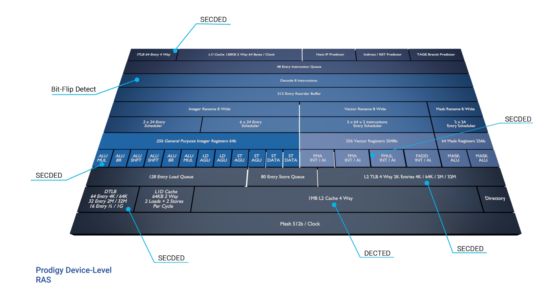 Öte yandan yeni Prodigy 2nm işlemciler, tek sokette 1024 adet 64-bit çekirdek barındırabiliyor ve bu çekirdekler 6,0 GHz’e kadar çalışabiliyor. Platform, 8 soketli sistemlerde toplam 8192 çekirdek, 16 soketli yapılarda ise 16.384 çekirdek ölçeğine ulaşabiliyor. Çipler, Out-of-Order mimarisi üzerine inşa edilmiş ve her çevrimde 8 komut yürütme kapasitesine sahip. Her çekirdek, 128 KB komut önbelleği (I-Cache) ve 64 KB veri önbelleği (D-Cache) içeriyor. Sistemde toplam 1 GB L2+L3 önbellek bulunuyor. TDP değerleri, modeline göre 30 watt’tan 1600 watt’a kadar değişiyor.